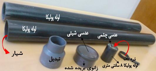 60 سانتي متر از لوله پوليكاي 140 سانتي متري را ببريد. توجه : در هنگام خريد لوله دقت كنيد كه لوله نرم تر را بخريد چون دو نوع لوله با همان قطر و جود دارد كه يكي محكم بوده و سنگين است و نمي توان در آن شيار ايجاد كرد. (بسيار مهم: دقت كنيد كه صاف بريده شود. اگر صاف نبريد هم محور كردن عدسي ها سخت مي شود.) لوله 60 سانتي متري را از بالا به پايين به خط راست ببريد (يك شيار در آن ايجاد كنيد). اين كار براي اين است كه لوله ي 60 سانتي متري روي لوله ي اول سوار شود و بتوان آن را به جلو و عقب حركت داد.حالا لوله سالم را داخل لوله 60 سانتي متري (كه شيار دارد و مي توان آن را كمي باز كرد) قرار دهيد. وقتي دو لوله كاملا روي هم قرار گرفتند مقواي مشكي را دور آن ها بپيچيد و وحكم چسب بزنيد. حالا شما لوله اي داريد كه مي توان طول آن را تنظيم كرد. بايد به سختي روي هم حركت كنند چون بعد از تنظيم كردن ديگر نبايد حركت كند.(بدنه اصلي تلسكوپ به تصوير نگاه كنيد البته تصوير بدون مقوا است و همان طور كه مي بينيد شيار باز است كه باعث ورود نور شده و تصوير را كمي مات مي كند. پس حتما بايد روي شيار ايجاد شده را بگيريد)